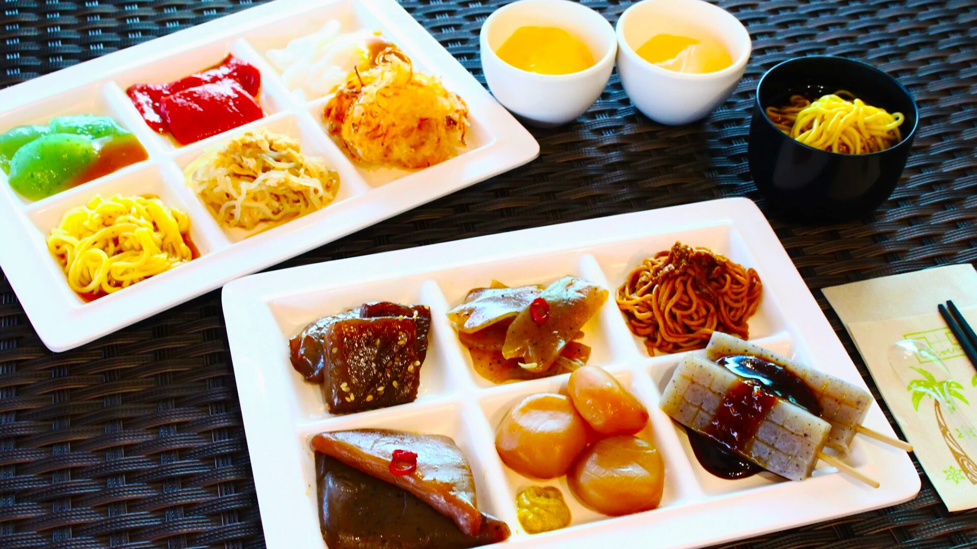 種類豊富な試食バイキングでは、こんにゃくラーメン、レバ刺し風こんにゃく、こんにゃくカレーなどちょっと珍しいこんにゃく製品がずらり。カロリーが低いこんにゃくなのでお腹いっぱいお楽しみください。