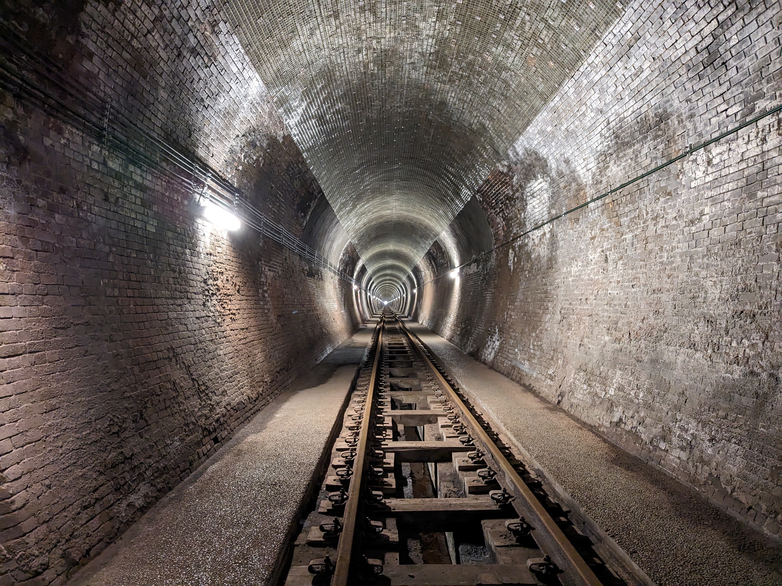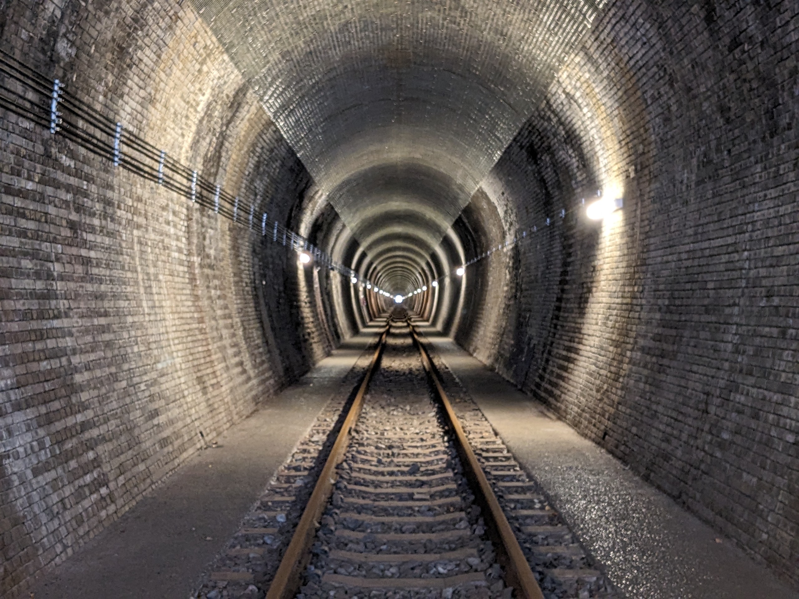 トンネル内には鉄道標識・待機所・水路が当時のまま残されています。壁や天井には蒸気機関車の煙突から排煙された煤が黒く付着していて、歴史を感じさせるトンネルとなっています。