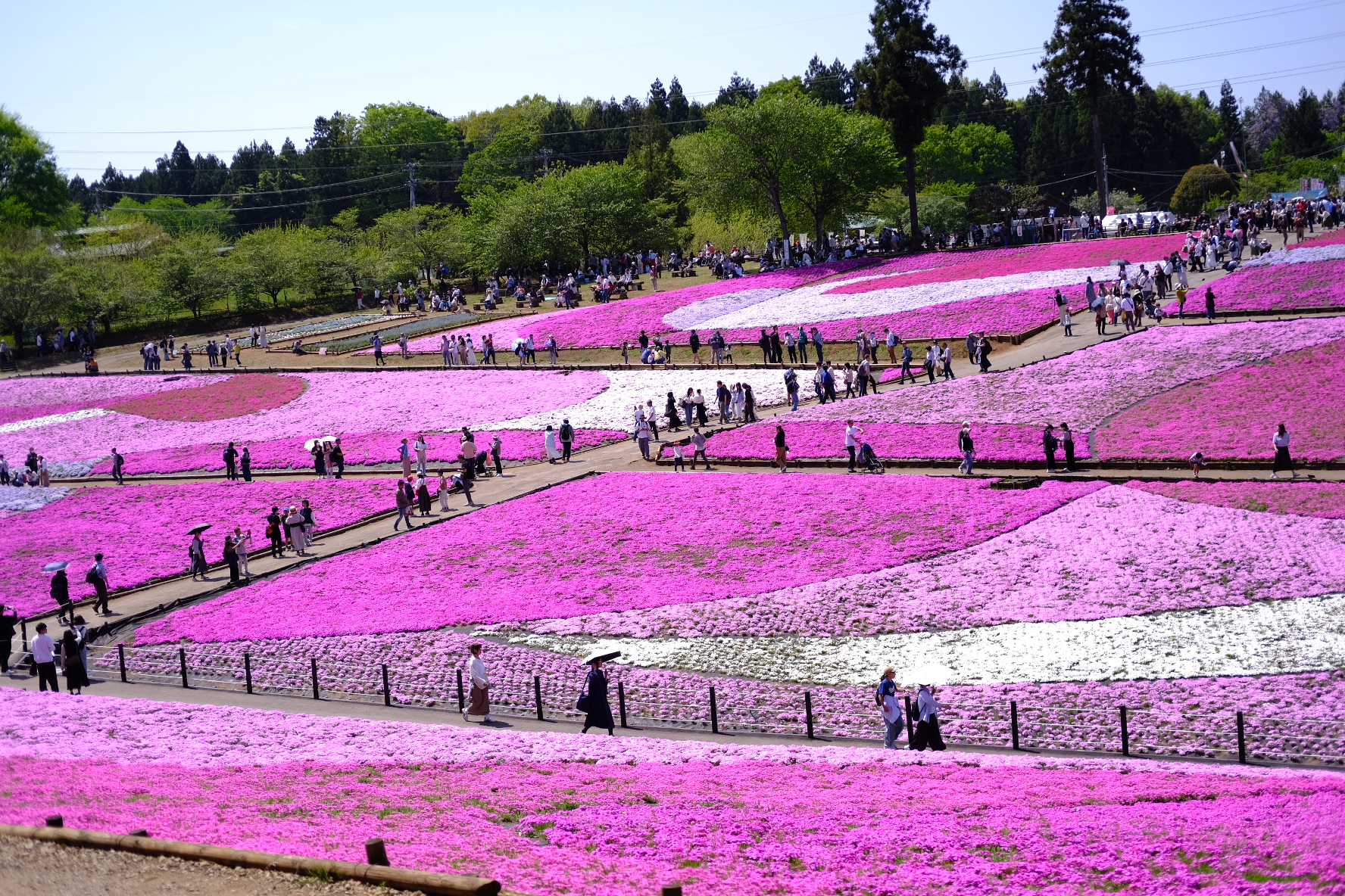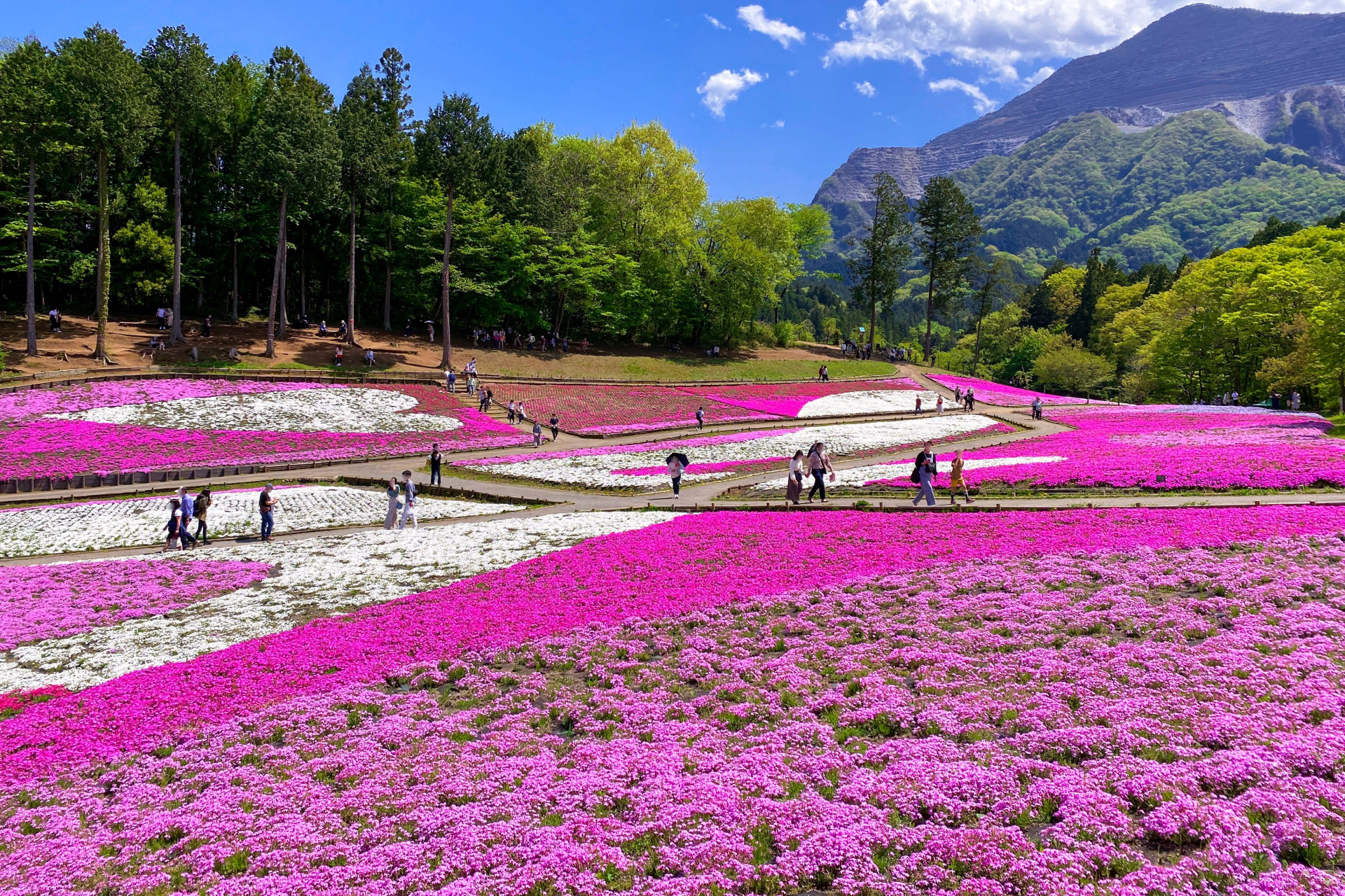 毎年4月中旬から5月上旬にかけて、ピンクや白、紫の芝桜が一斉に咲きそろい、まるで花のじゅうたんのような景色が広がります。園内には散策しやすい遊歩道が整えられていて、花の近くをゆっくり歩きながら春の香りや心地よい空気を味わえます。また、地元のおいしいグルメが集まる「秩父路の特産市」も開催されるので、楽しみがさらに広がります♪