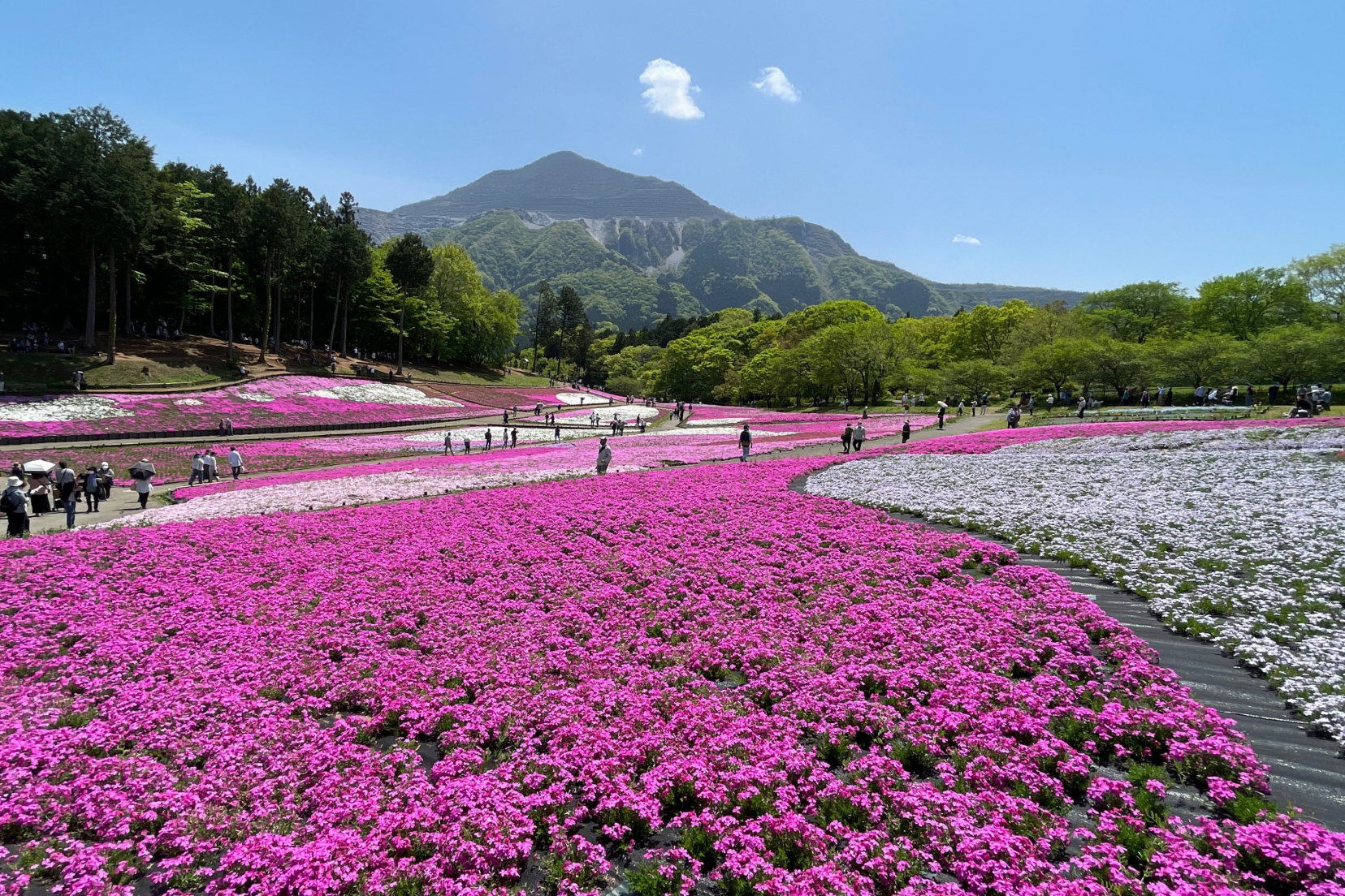 秩父のシンボル・武甲山のふもとに広がる羊山公園には、春になると一面を色鮮やかに染める「芝桜の丘」を鑑賞。