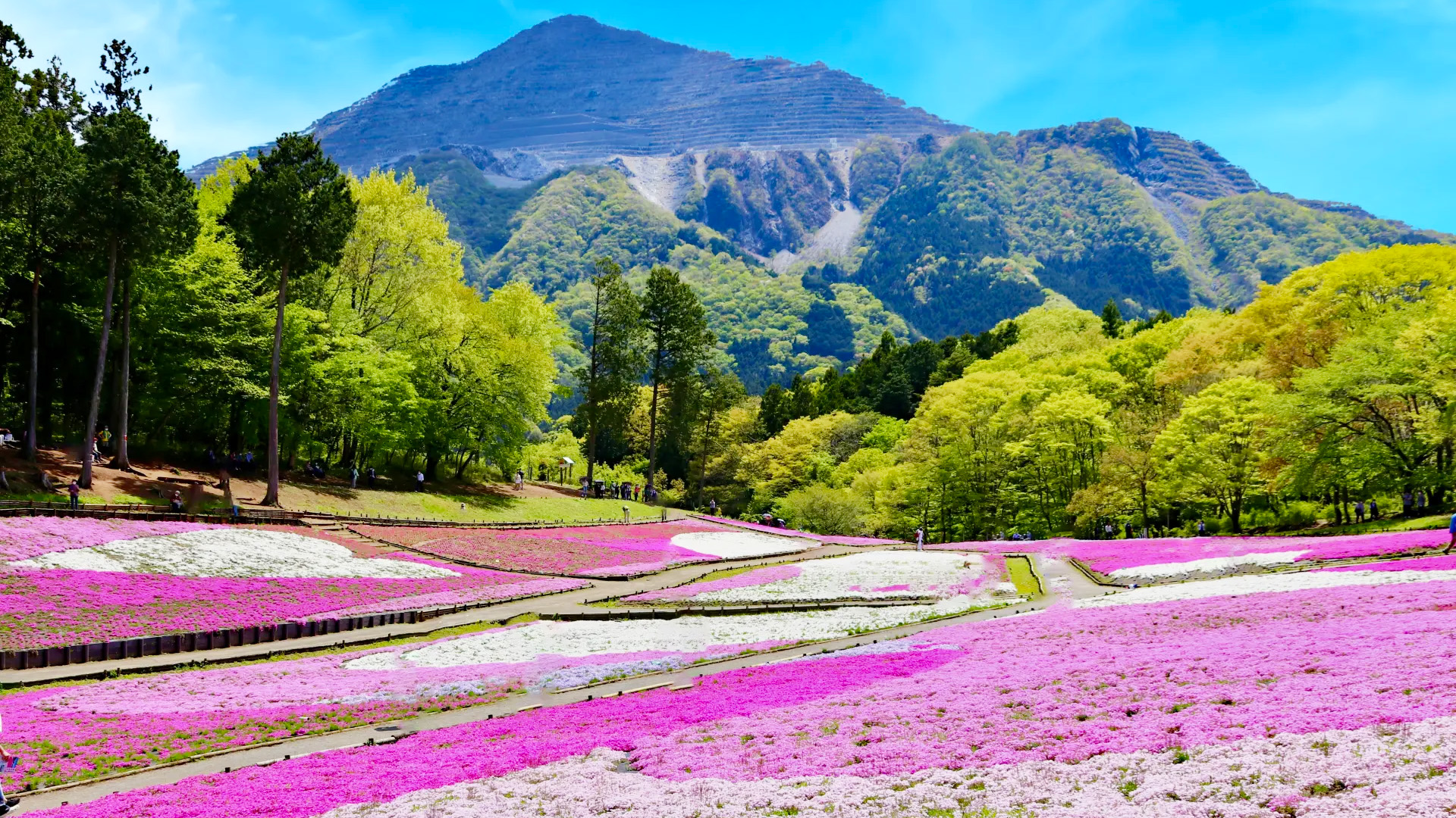 秩父のシンボル・武甲山のふもとに広がる羊山公園には、春になると一面を色鮮やかに染める「芝桜の丘」を観賞。