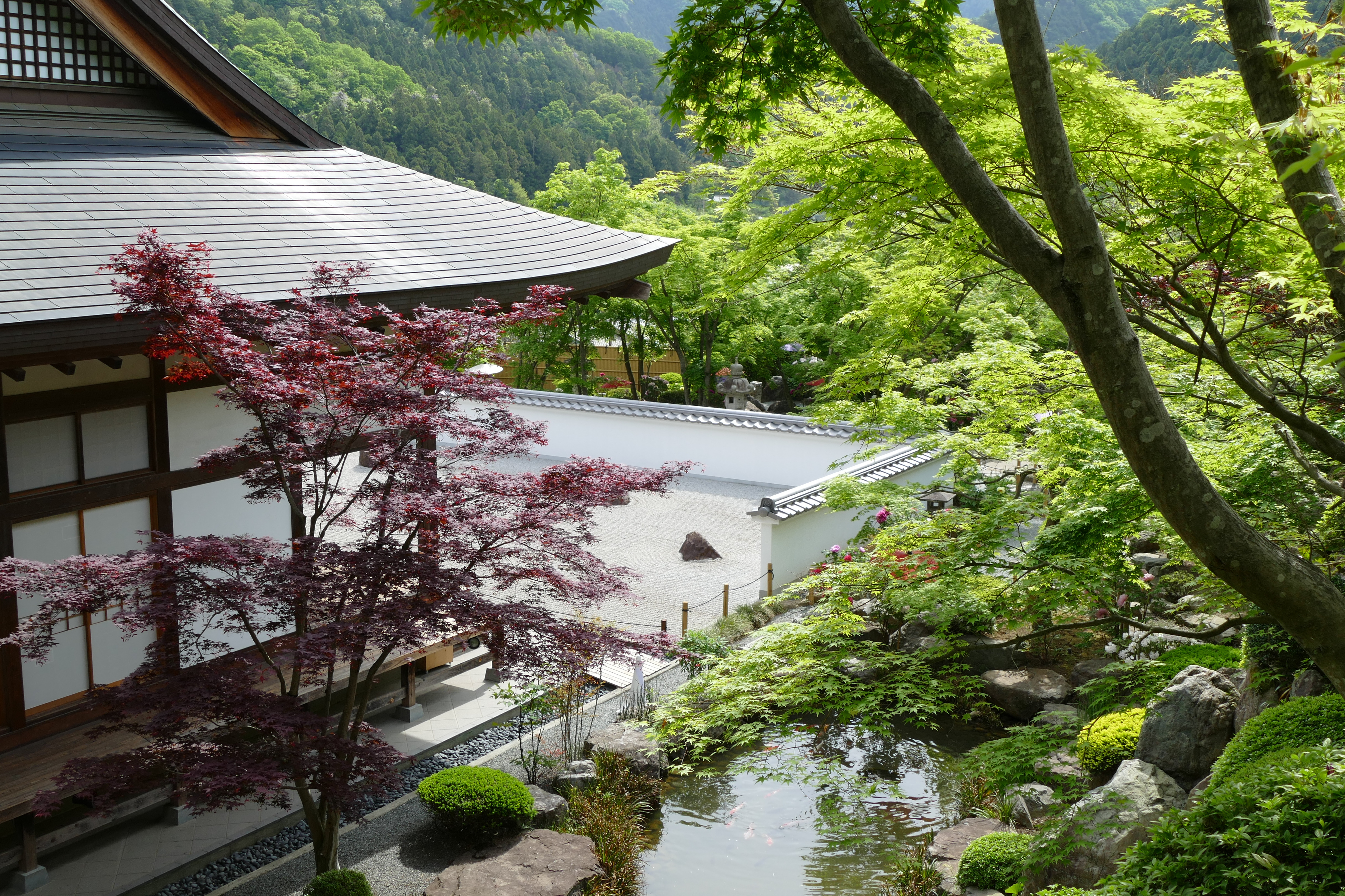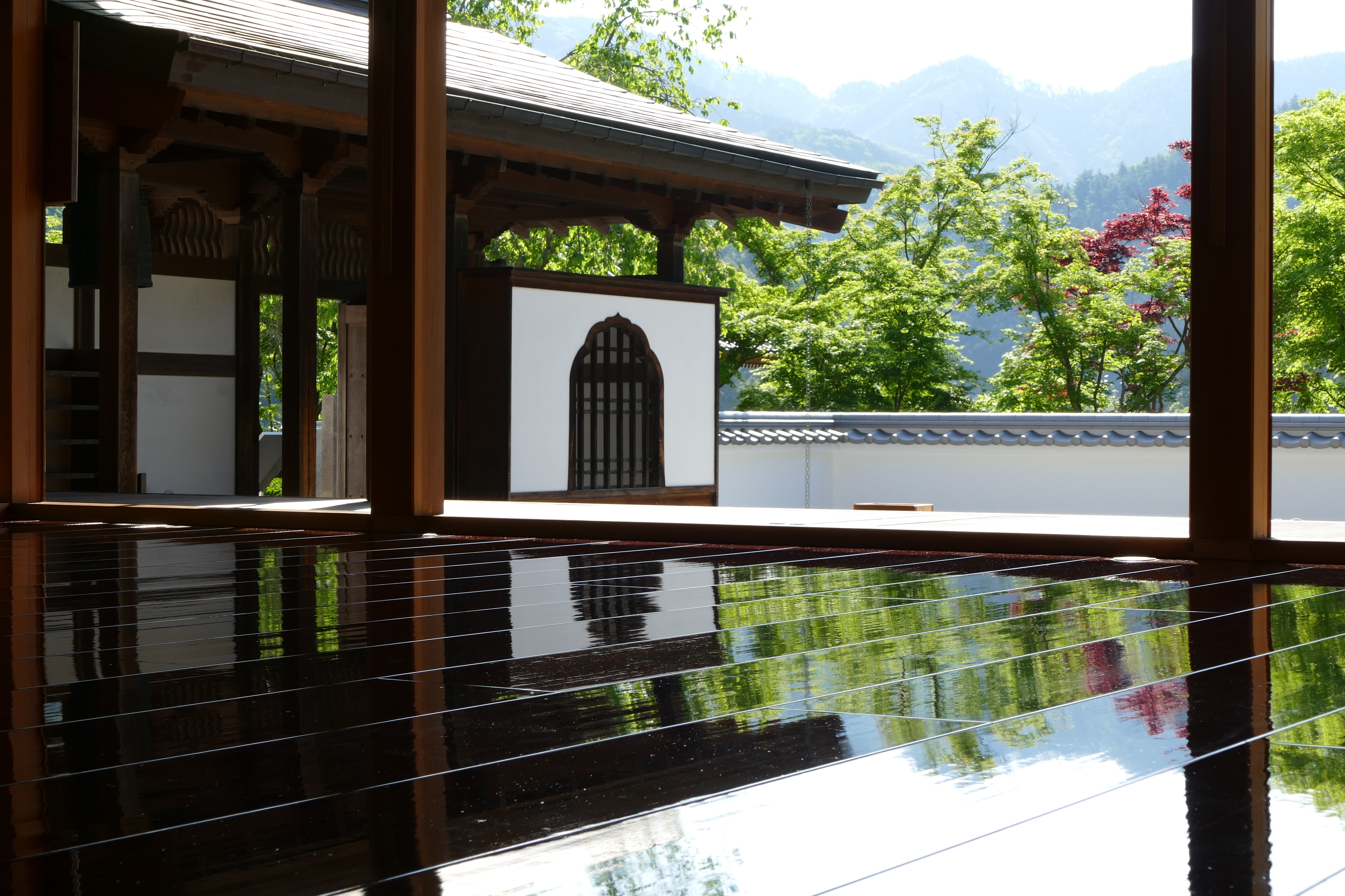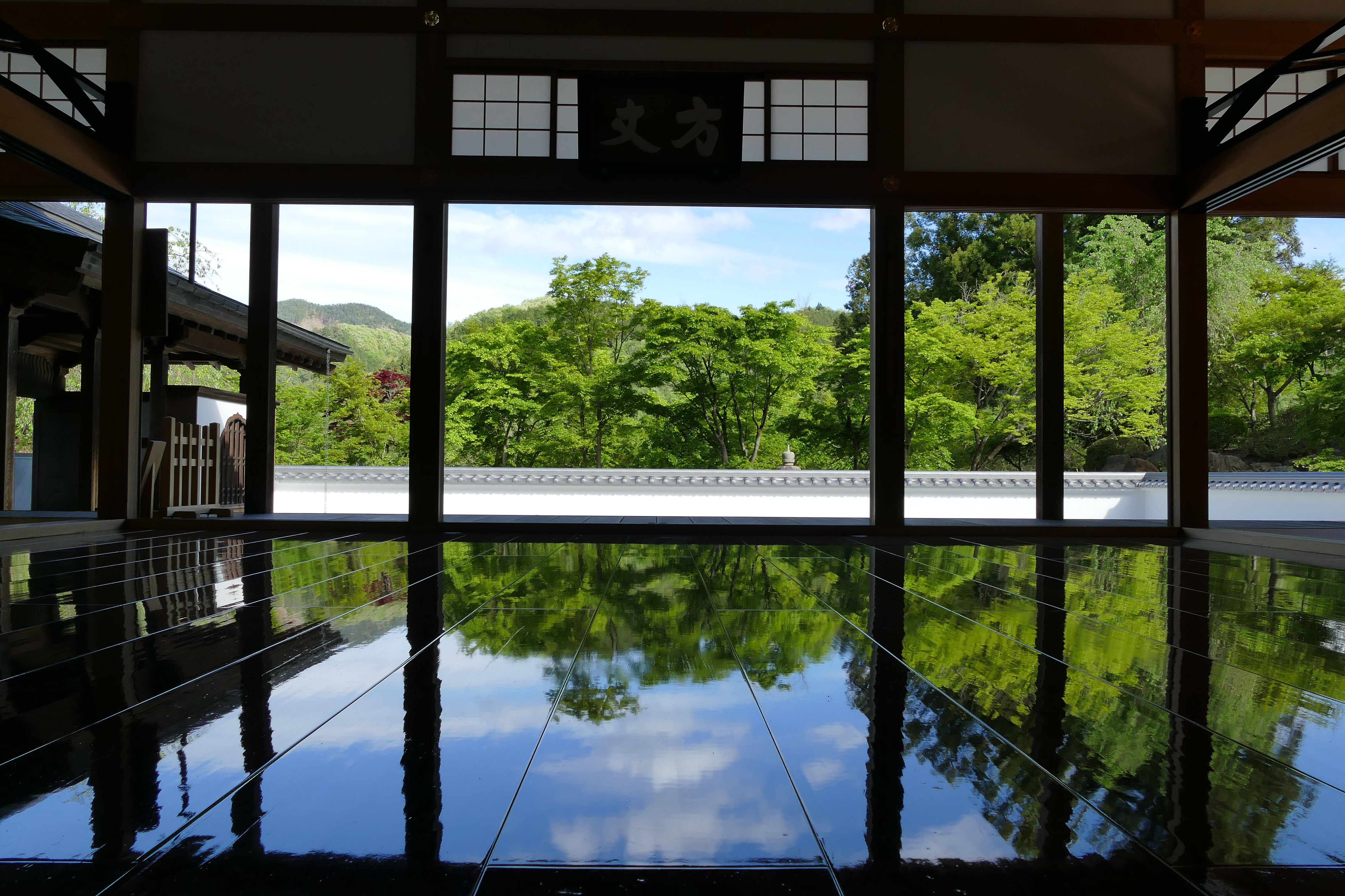 まるでもみじが水鏡に映るように美しく映えているのはピカピカに磨き上げられた床で、この床の広さは28畳。ここに本堂を囲むように新緑のもみじが映りこみ「床もみじ」となります。ピカピカに磨き上げられた床にリフレクションする「床もみじ」の絶景をお楽しみください。