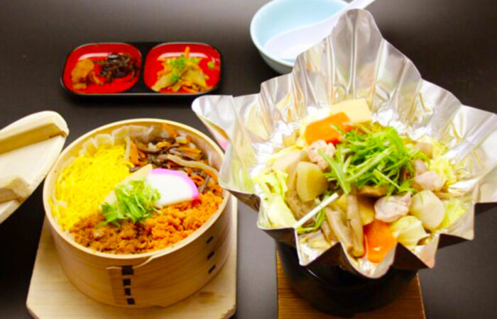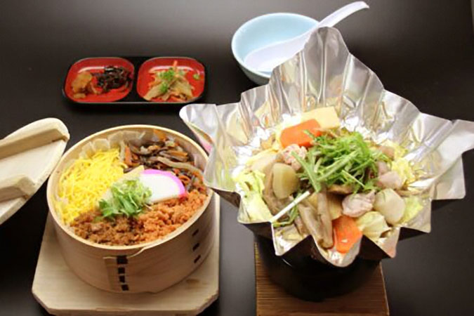 鶴ヶ城のすぐそばに位置し、城見学とあわせて立ち寄れる便利な立地が魅力のひとつ。ご昼食には、会津名物「わっぱ飯」をはじめ、鶏ももときのこの鍋、二点盛(ごぼう・漬物)がセットになっており、彩り豊かでバランスの取れた食事が味わえます。わっぱ飯は、杉の香りがほんのり香る木製の器に、会津の季節の食材がふんだんに盛り付けられており、見た目にも華やかで食欲をそそります。鶏ももときのこ鍋は、地元の新鮮食材を使用した温かい一品で、寒い季節にぴったり!