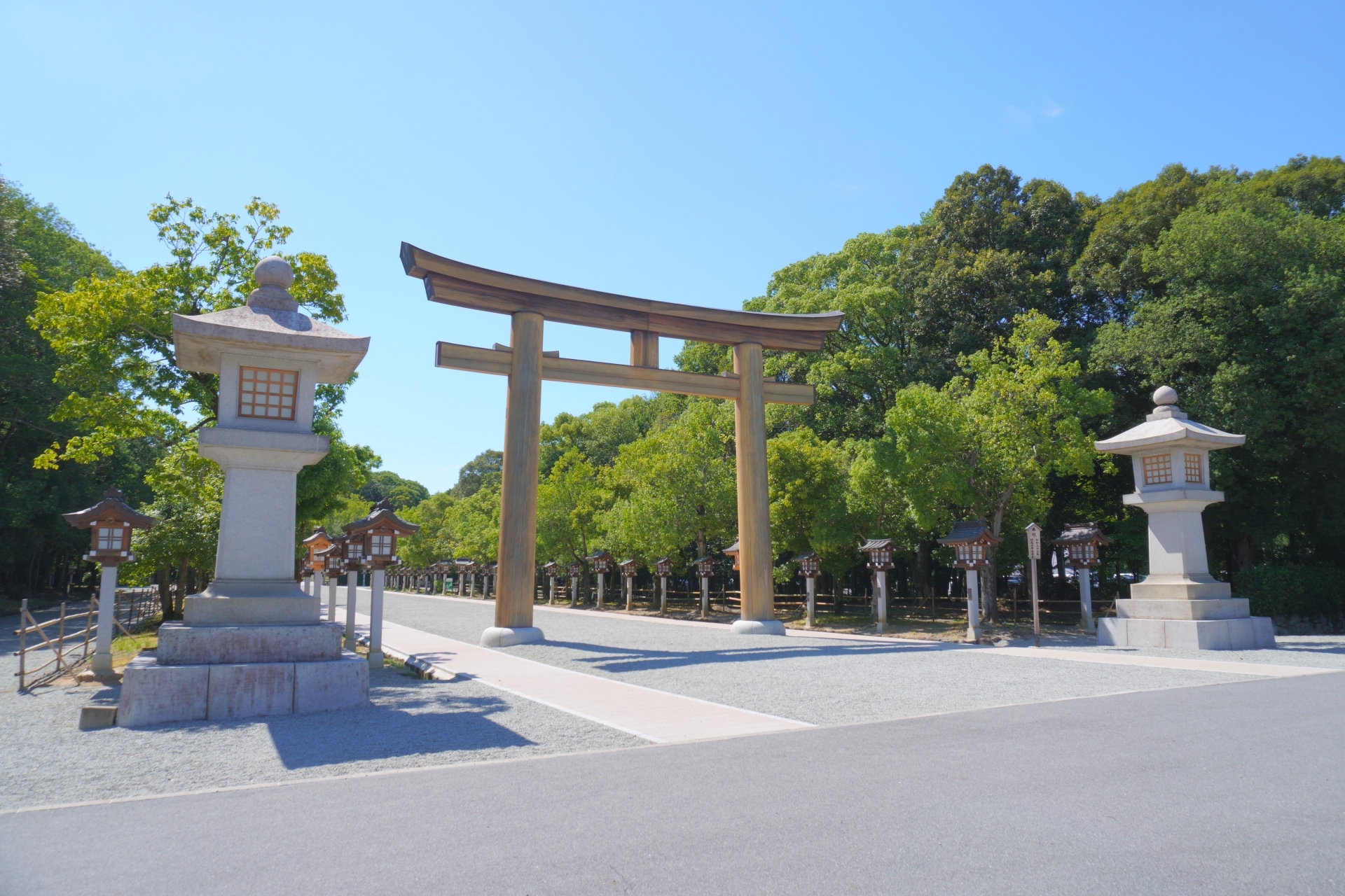 初代天皇・神武天皇を祀る由緒ある神社で、広い境内は静かで開放的。