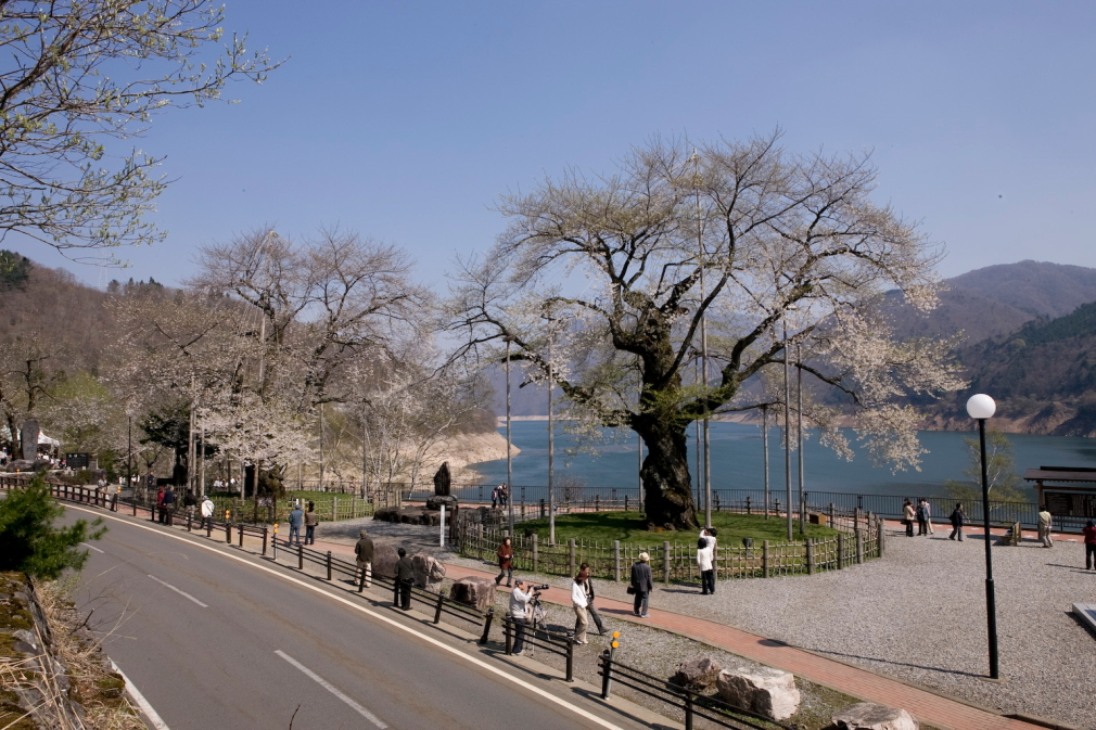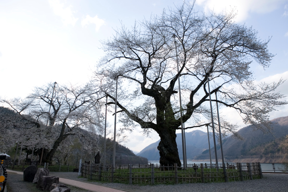御母衣湖(みぼろこ)のほとりに咲く、樹齢約500年ともいわれる2本のアズマヒガンザクラ。ダム建設によって湖底に沈む運命にあった巨木を移植し、奇跡的に甦った“奇跡の桜”として知られています