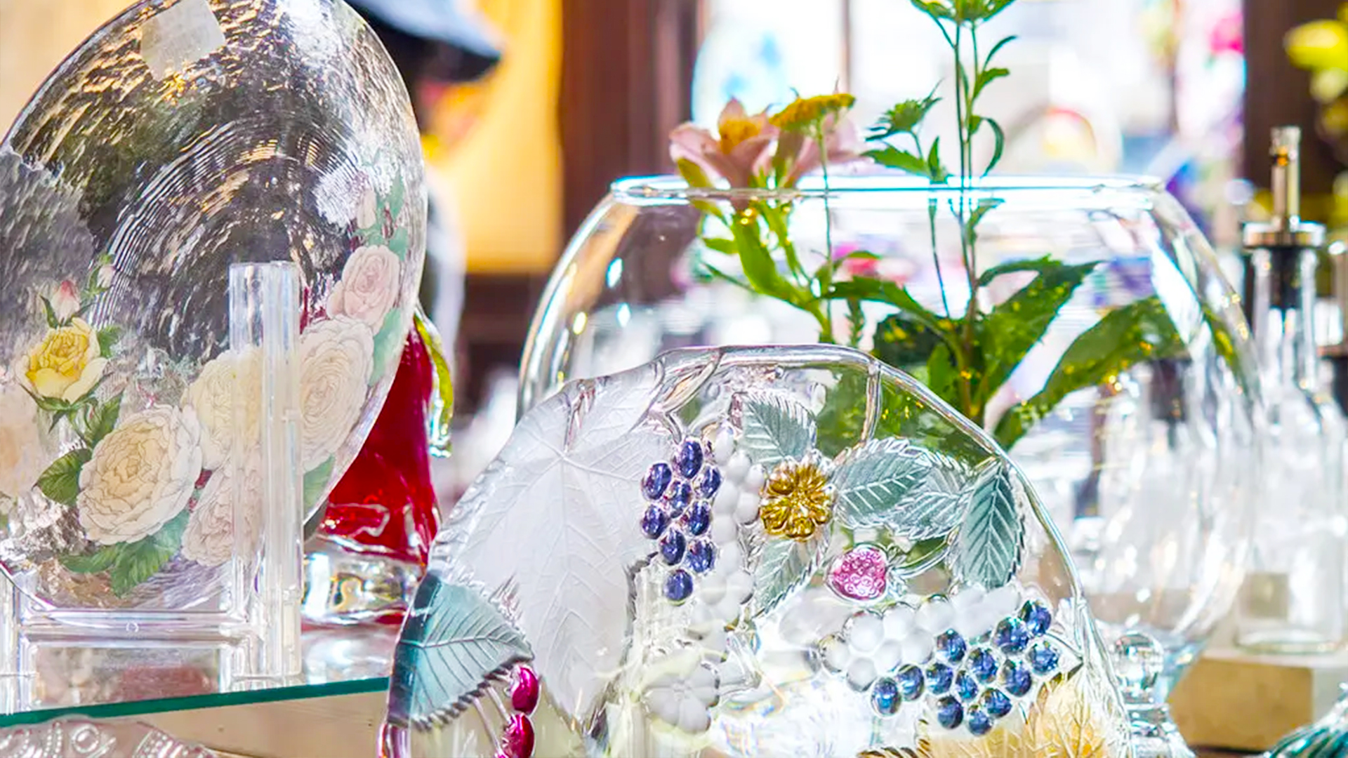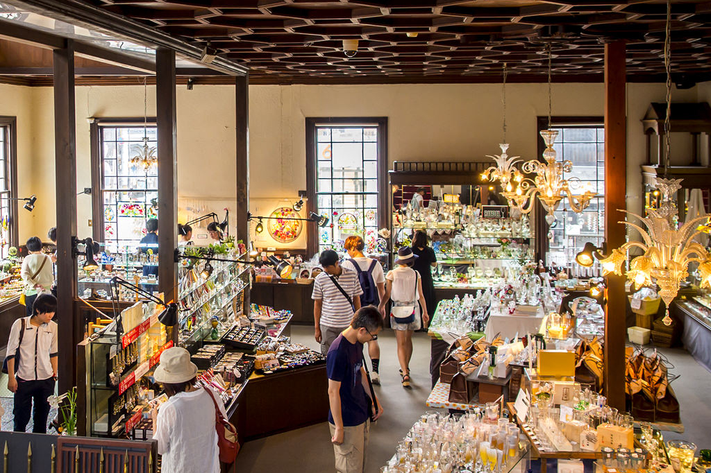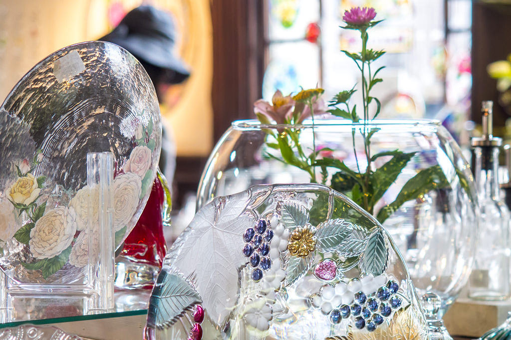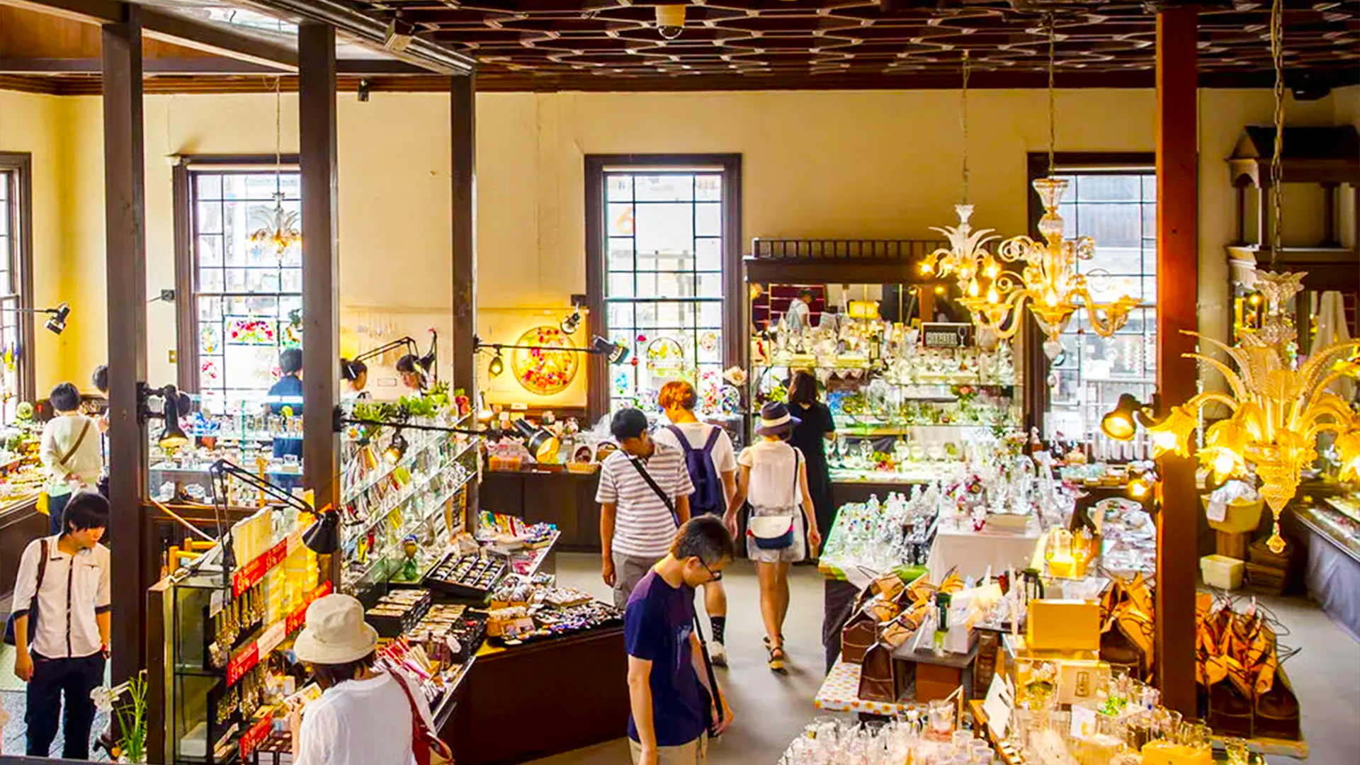 ガラスショップやギャラリー、体験工房、カフェ、レストラン、地元特産品を扱う店舗などが点在し、散策しながら買い物や食事、アート鑑賞を楽しむことができます。
