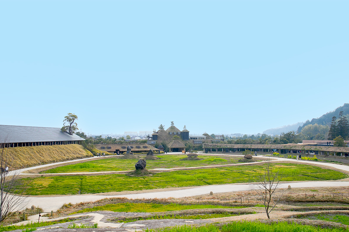 まるで物語の世界に迷い込んだかのような草屋根の建物が印象的で広大な敷地内には、和菓子・洋菓子それぞれのショップやカフェ、工房が点在。